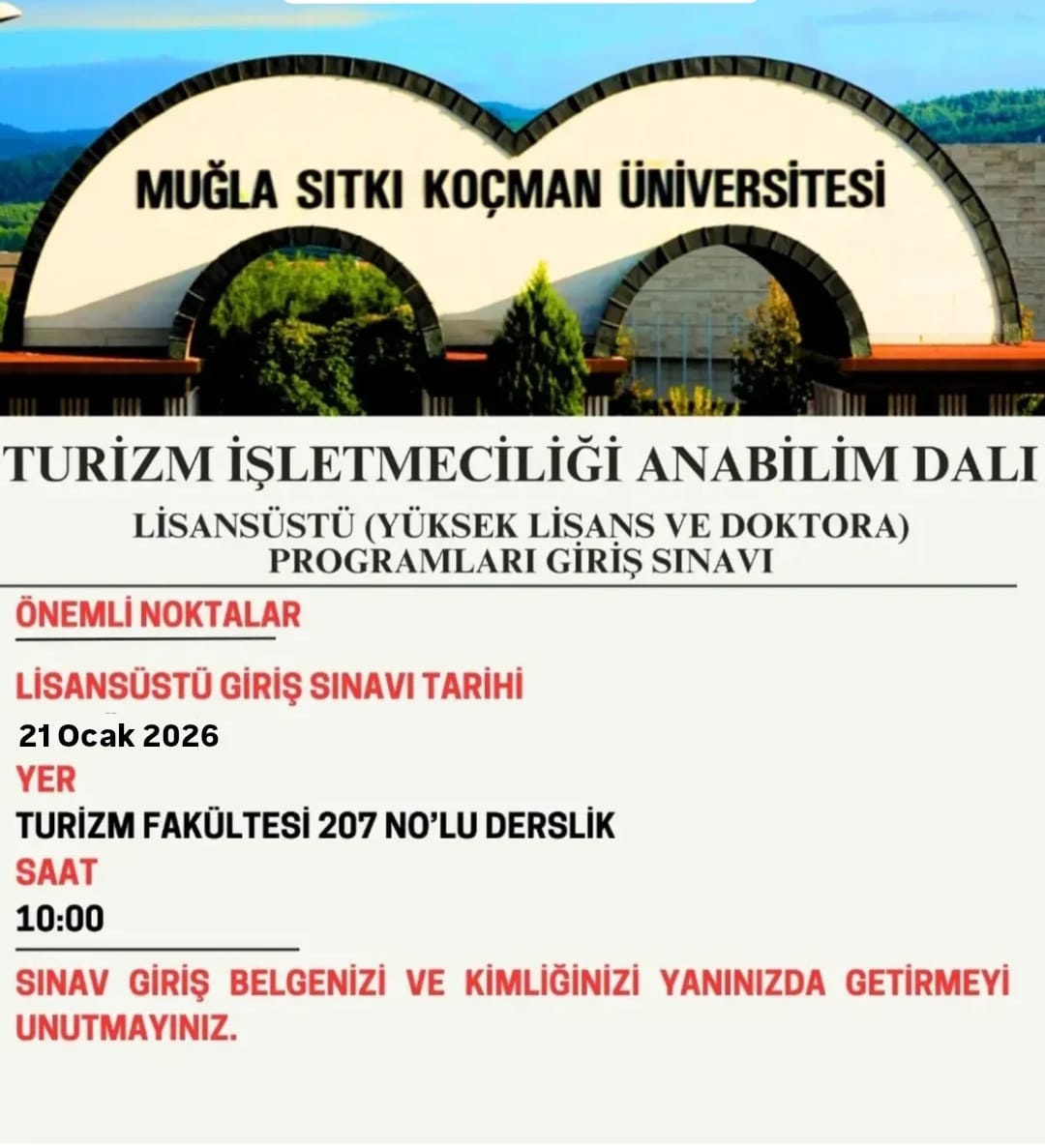 Turizm İşletmeciliği Ana Bilim Dalı Lisansüstü sınavı 21 Ocak 2026 tarihinde saat 10:00’da Turizm Fakültesi'nde 207 no'lu derslikte yapılacaktır.